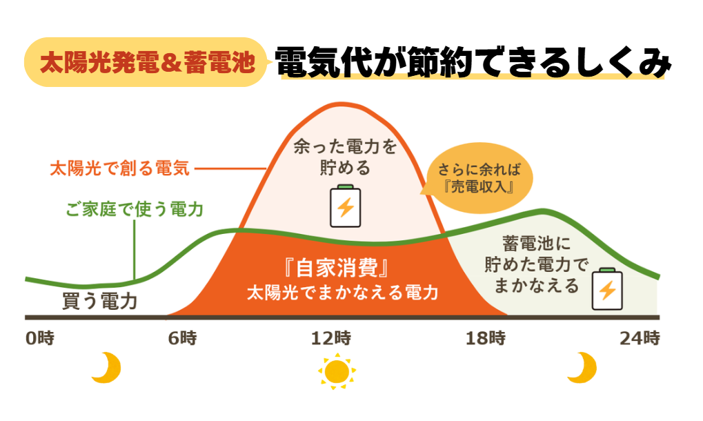 昼間に発電した電気を蓄電し、夜間に使用。さらに、昼間に蓄電しきれなかった電気は売電収入となります。