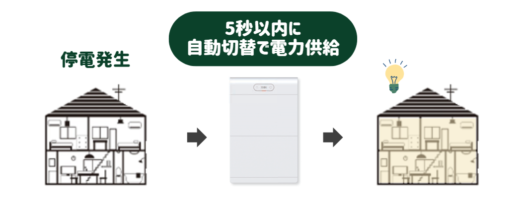停電時は5秒以内に自動切替で電力供給され、